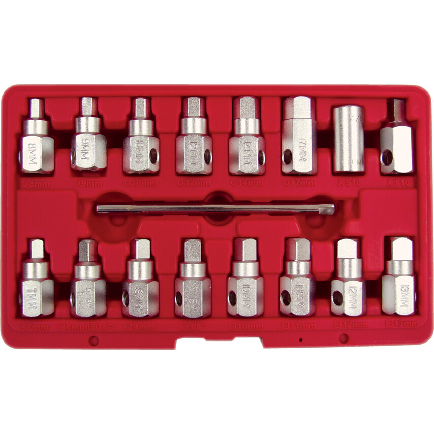 DPK017 Kiváló minőségű, 3/8"-os csatlakozású dugókulcsok teljes készlete olajleeresztő csavarokhoz, csavarhajtó karral. Szatén felületű króm-vanádium ötvözetből készült. Tartalom: négyszögdugókulcs: 7mm, 8mm (5/16"), 9mm, (3/8"), 10mm, 11mm, 12mm és 13mm; négyszög-anya 10mm; dugókulcs 8, 9, 10, 12, 14, és 17mm; háromszögletű csavar 10mm; csavar hajtókar.
