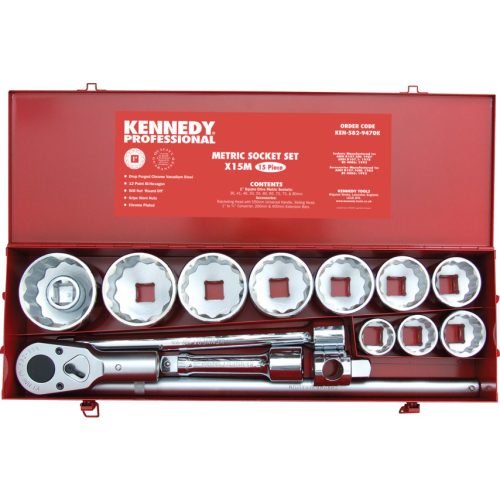 Dugókulcsok: 36, 41, 46, 50, 55, 60, 65, 70, 75 és 80 mm.Kiegészítők: ipari, irányváltós racsni és egy csúszó T-fej, 550 mm-es univerzális fémnyél a két fejhez, 200 és 400 mm-es standard hosszabbító. Fémből készült erős tárolódoboz.