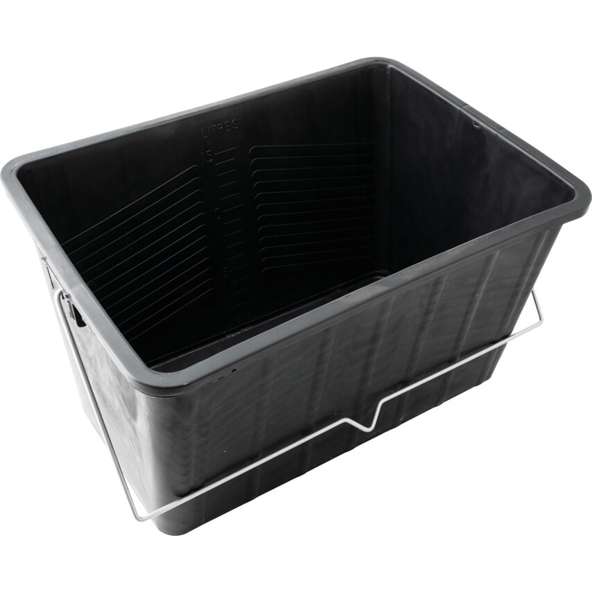 Fekete műanyag festővödör fém füllel és peremmel a festőhenger rögzítéséhez.