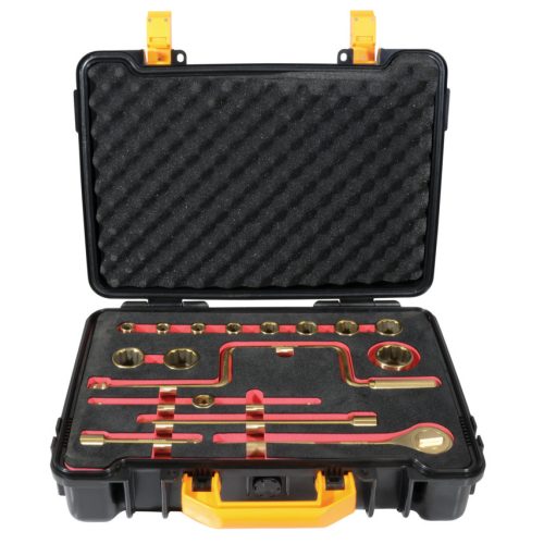A szikramentes szerszámokat azért használják, hogy kizárják a véletlen tüzek vagy robbanások keletkezésének esélyét a tűz-vagy robbanásveszélyes munkahelyeken. Ezek a szerszámok a normál kivitelű szerszámokkal ellentétben nem képeznek szikrát kemény felülethez történő ütés következtében. A szikramentes szerszámok használata alapvetően fontos sok ipari alkalmazásnál, úgymint vegyipar, olajipar, festékszóró fülkékben végzett műveletek, hajózással kapcsolatos ipari műveletek, bányászat, papírgyártás, vagy bármely más olyan munkaterület, ahol gyúlékony gőzök vagy tűzveszélyes maradványanyagok vannak jelen. Az alu-bronz szikramentes biztonsági szerszámok keménysége 25 HRC, szakítószilárdságuk 75-85 kp/mm2. A szikramentes biztonsági szerszámok karbantartását nagy körültekintéssel kell végezni, rendszeres időközönként szükséges tisztítani/újraélezni, hogy eltávolítsuk az esetlegesen rárakódott vastartalmú anyagokat vagy más szennyeződéseket, melyek ronthatják a szerszámok használati értékét.Dugókulcs készlet, 1/2" csatlakozóvalÖsszetétel:Dugókulcsok: 10, 11, 12, 13, 14, 17, 19, 22, 24, 27, 30 és 32 mmKiegészítők: 250 mm-es racsnis hajtószár, 250 mm-es csúszórudas T-hajtószár, 400 mm-es gyorsbehajtó, 125 és 250 mm-es toldószár.